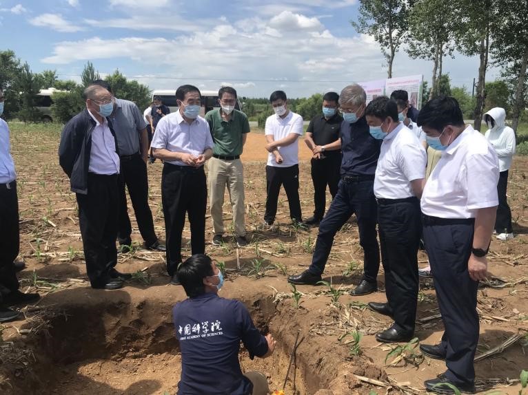 在扎賚特旗玉米保護(hù)性耕作示范田,姜明向調(diào)研組介紹了中國科學(xué)院“黑土糧倉”科技會(huì)戰(zhàn)的目標(biāo)及重點(diǎn)任務(wù),目前在東北三省一區(qū)的實(shí)施進(jìn)展及重要成果。關(guān)義新從區(qū)域氣候條件、土壤環(huán)境特征等角度介紹了開展保護(hù)性耕作的必要性,以及實(shí)施多年來取得的顯著效果,并結(jié)合土壤剖面特點(diǎn)講述了開展保護(hù)性耕作對(duì)黑土地保護(hù)的重要性。調(diào)研組一行在認(rèn)真聽取介紹后,對(duì)東北地理所開展的科技示范工作和取得的成效給予充分肯定,同時(shí)就黑土地概念及保護(hù)立法的相關(guān)問題進(jìn)行了交流。