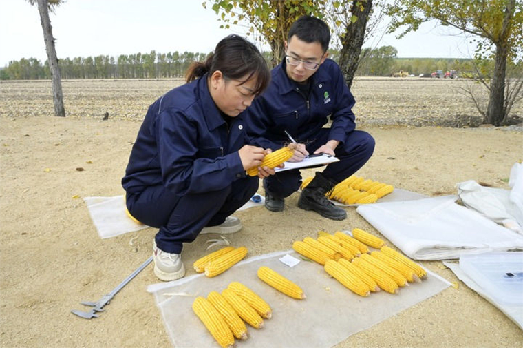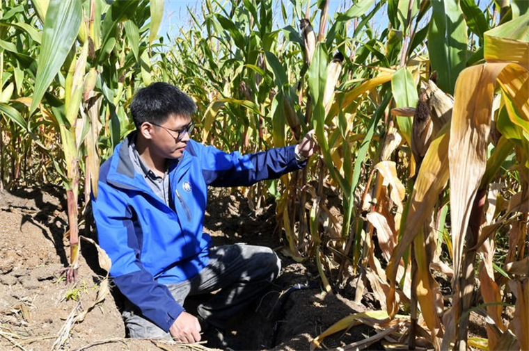 ↑9月27日,研究人員在位于雙鴨山市友誼縣的友誼農(nóng)場查看玉米長勢。新華社記者 石楓 攝