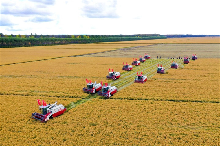 ↑這是9月27日在位于雙鴨山市友誼縣的北大荒農(nóng)業(yè)股份有限公司友誼分公司拍攝的秋收現(xiàn)場(無人機照片)。新華社記者 石楓 攝