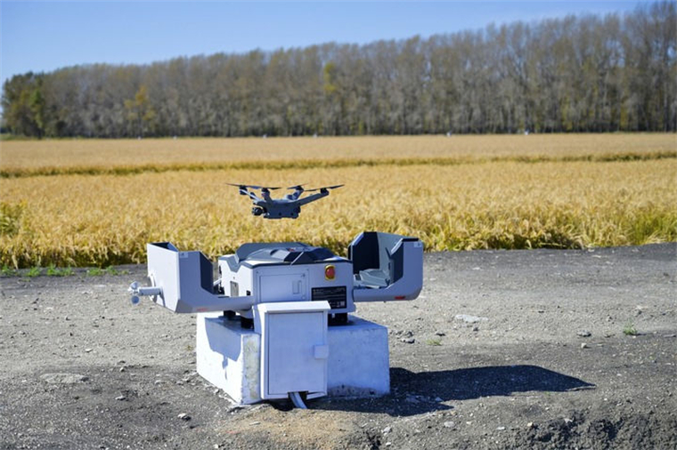 ↑9月28日,在位于雙鴨山市的中國科學(xué)院北大荒友誼現(xiàn)代農(nóng)業(yè)實驗站,完成智能巡田任務(wù)的無人機在定期自動返航。新華社記者 石楓 攝