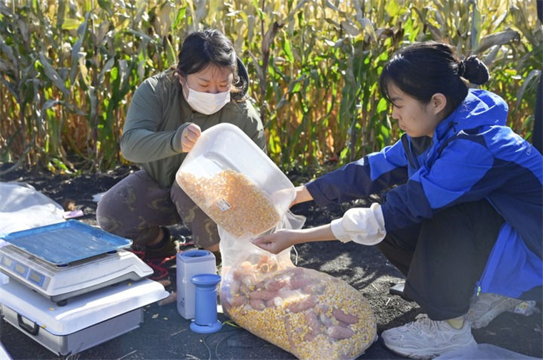 ↑9月29日,在位于佳木斯市樺南縣的曙光農(nóng)場,研究人員記錄當(dāng)季收獲玉米籽粒的重量和含水量。新華社記者 石楓 攝