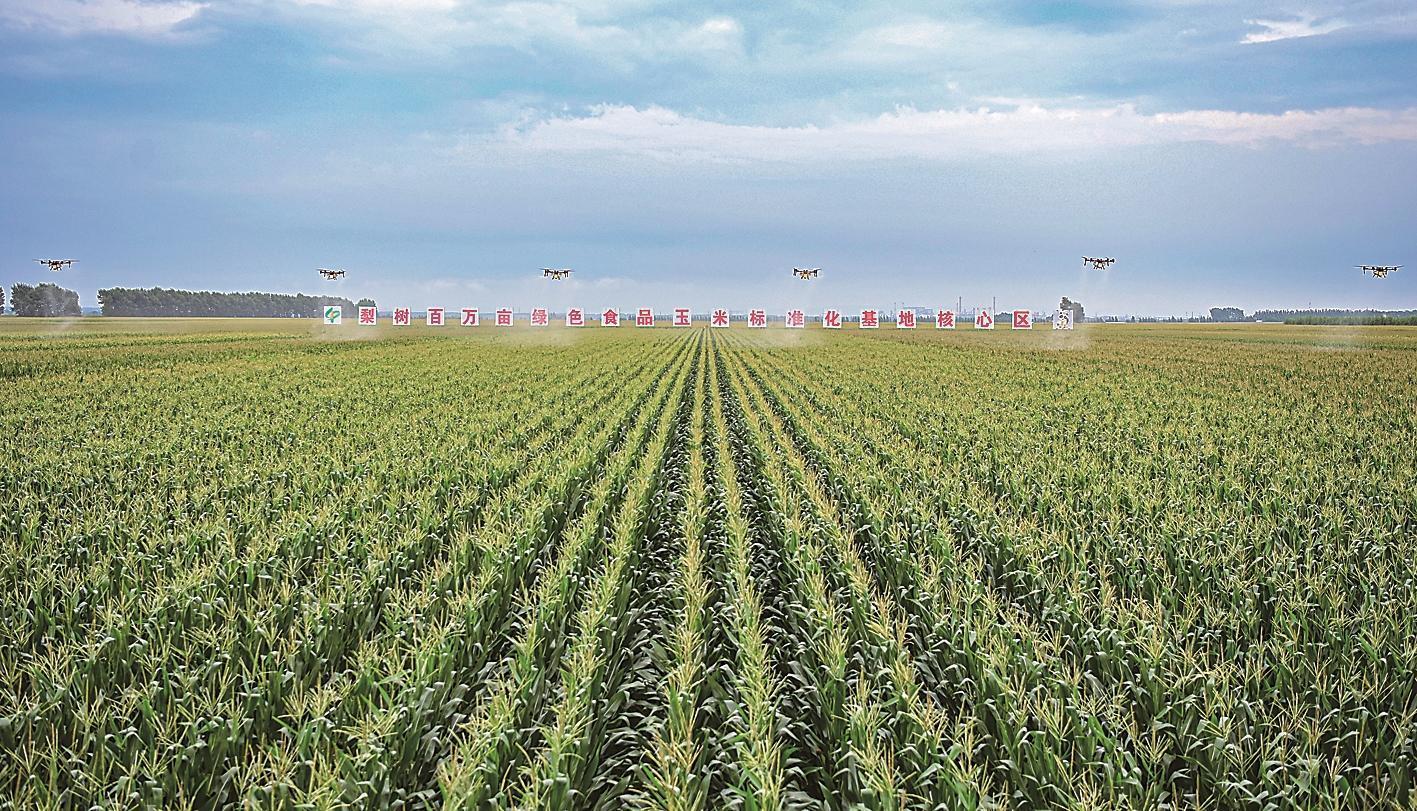 在梨樹縣國(guó)家百萬(wàn)畝綠色食品原料(玉米)標(biāo)準(zhǔn)化生產(chǎn)基地核心示范區(qū),工作人員開(kāi)展植保無(wú)人機(jī)飛防作業(yè)。 本報(bào)記者 趙博 攝