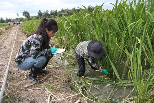 在鎮賚縣坦途鎮的蘇吉匯農業科技有限公司茭白田里,曾經白茫茫一片的重度鹽堿地,如今已化作千畝碧波,碧綠的茭白葉泛著油亮的光澤,隨風起伏,仿佛一片綠色的海洋。測產專家們就走進中國科學院東北地理與農業生態研究所在大田布置的控制實驗基地,交流研究進展和定位監測記錄的結果,大家對單項技術以及技術集成的應用效果表現出極大興趣和認可。專家組隨后來到生產田塊,“這片葉子顏色深綠,說明肥水管理到位。”“個別葉鞘下部出現少量褐斑,后期要注意針對性處理。”測產還未開始,專家們就已俯身田間,或蹲或立,仔細查看茭白的株高、葉色、根系發育情況。他們時而用手指輕捻葉片,感受葉片的質地;時而用尺測量株行距,精準記錄數據。他們還不時與身旁的農戶和企業技術人員交流意見,為這片茭白田的豐收“把脈問診”。陽光灑在他們專注的臉上,汗水順著鬢角滑落,卻絲毫沒有影響他們工作的熱情。