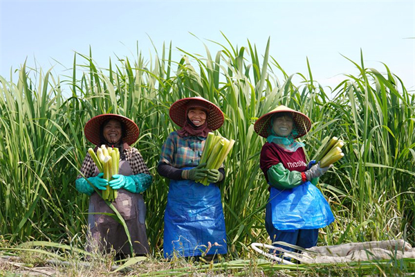 翠綠的茭白田,工作人員忙著采收茭白,臉上洋溢著豐收的喜悅。