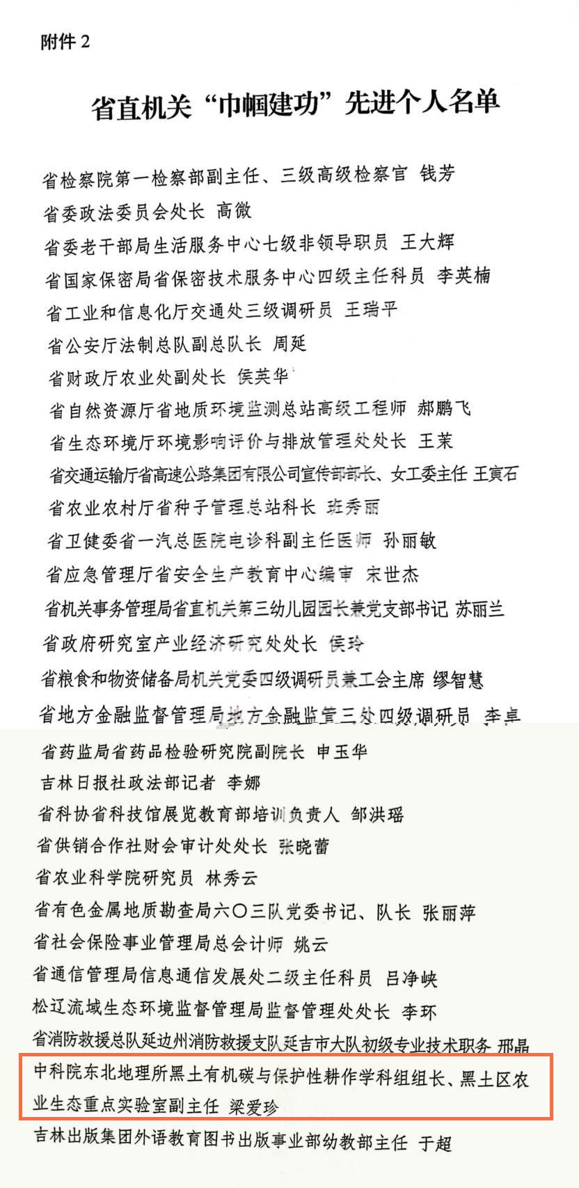 為表揚先進、培樹典型,省直機關婦工委印發《關于表揚2022年省直機關“巾幗建功”先進個人(集體)的通報》,對14個省直機關“巾幗建功”先進集體和29名省直機關“巾幗建功”先進個人給予通報表揚。東北地理與農業生態研究所黑土有機碳與保護性耕作學科組組長、黑土區農業生態重點實驗室副主任梁愛珍,榮獲2022年省直機關“巾幗建功”先進個人稱號。