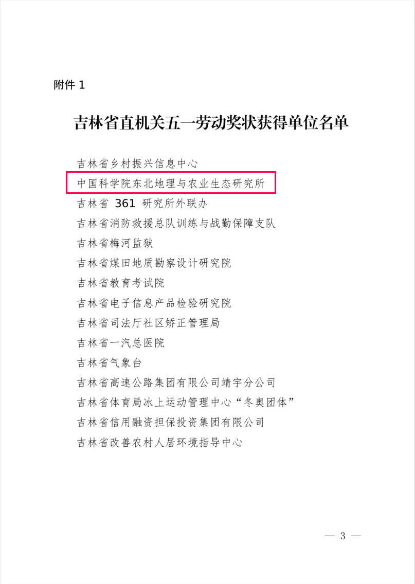 喜報頻傳!中國科學院東北地理與農業生態研究所榮獲吉林省直機關五一勞動獎狀!