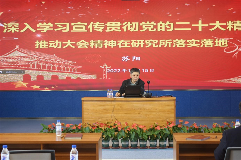 會上,蘇陽介紹了中國共產(chǎn)黨第二十次全國代表大會的概況,并結(jié)合本所實際工作從重要意義、偉大成就、目標(biāo)任務(wù)、謀劃部署、責(zé)任使命5個方面對黨的二十大精神進(jìn)行了詳細(xì)解讀。對標(biāo)黨中央學(xué)習(xí)要求、院黨組學(xué)習(xí)部署,對本所學(xué)習(xí)宣傳貫徹黨的二十大精神進(jìn)行了系統(tǒng)部署。