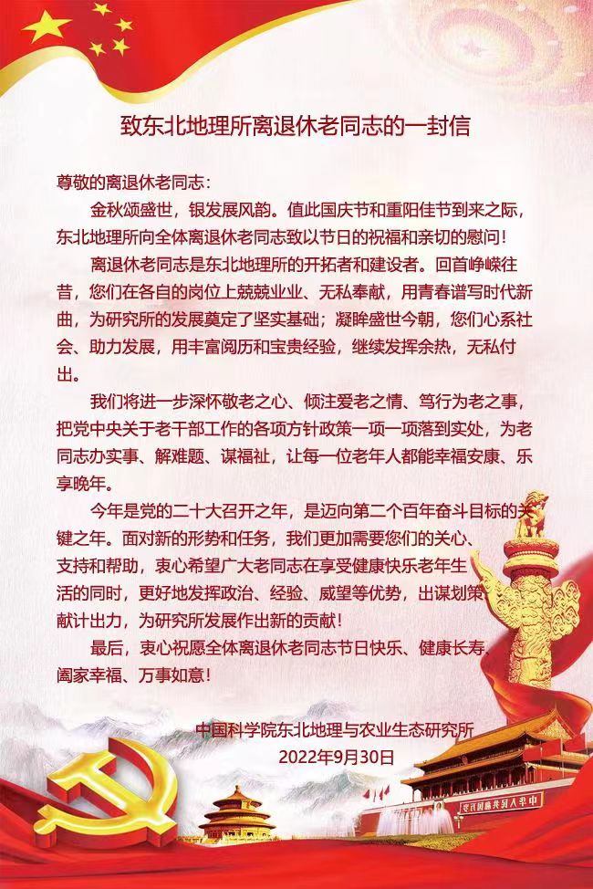 金秋十月,神州大地天清氣朗,山河錦繡。中國共產黨第二十次全國代表大會在舉世矚目中圓滿完成各項議程和崇高使命,歷時7天勝利閉幕。這是一次舉旗定向、凝聚力量、團結奮進的大會,在黨和國家發(fā)展進程中具有極其重大的歷史意義。東北地理所作為國家戰(zhàn)略科技力量,深入理解和準確把握黨的二十大提出的各項工作部署至關重要。所黨委從迎接黨的二十大到學習宣傳貫徹黨的二十大精神都做出了明確的部署和具體的安排。針對離退休干部隊伍的特點,東北地理所組織開展形式多樣的活動,迎接黨的二十大和學習宣傳貫徹黨的二十大精神,切實引領離退休干部感黨恩、聽黨話、跟黨走,為黨的事業(yè)傳播好聲音、匯聚正能量、作出新貢獻。