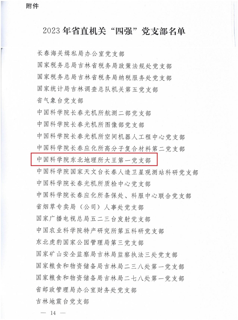 吉林省直機(jī)關(guān)工委為表彰先進(jìn)、鼓舞士氣,充分發(fā)揮先進(jìn)典型的示范引領(lǐng)作用,激勵(lì)省直機(jī)關(guān)各級(jí)黨組織和廣大黨員干部在新時(shí)代新征程展現(xiàn)新?lián)?dāng)、新作為,共命名265個(gè)黨支部為“省直機(jī)關(guān)‘四強(qiáng)’黨支部”,東北地理所大豆第一黨支部位列其中。