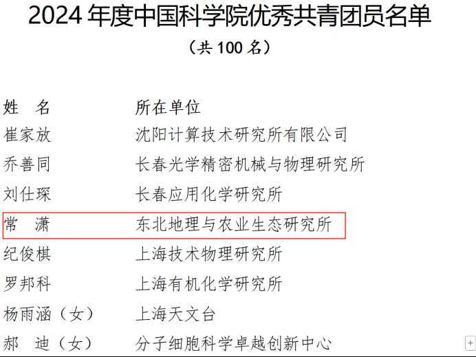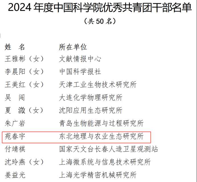 為表彰先進、樹立典型,激勵團青組織和廣大團員、團干部奮勇爭先、再創(chuàng)佳績。近日,中國科學(xué)院團委發(fā)文對29個五四紅旗團委、30個五四紅旗團支部、50名優(yōu)秀共青團干部、100名優(yōu)秀團員青年進行表彰。中國科學(xué)院東北地理與農(nóng)業(yè)生態(tài)研究所團委書記苑春宇榮獲“2024年度優(yōu)秀共青團干部”稱號、2023級博士研究生常瀟榮獲“2024年度中國科學(xué)院優(yōu)秀共青團員”稱號。