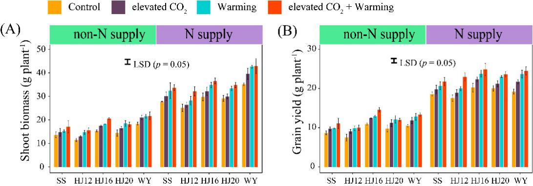 圖1 大氣CO2濃度和溫度升高條件下5個品種水稻的生物量(A)和產量(B)