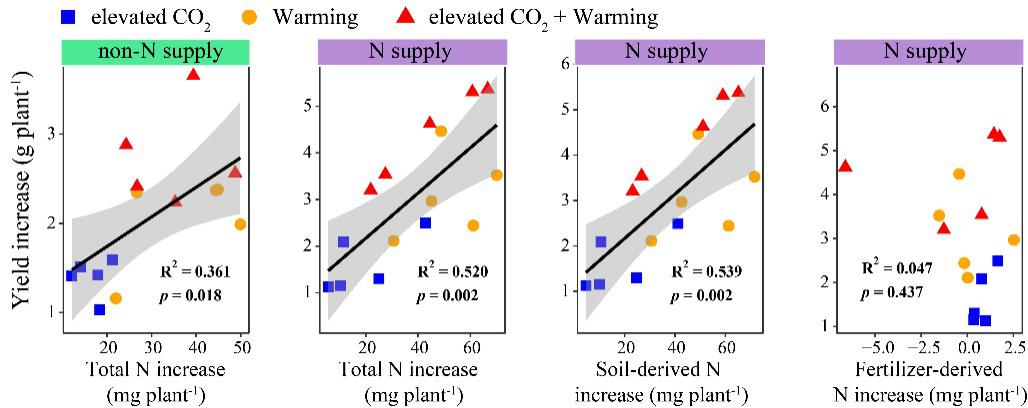 圖3 大氣CO2濃度和溫度升高條件下,氮吸收增加量與產量增加的相關性