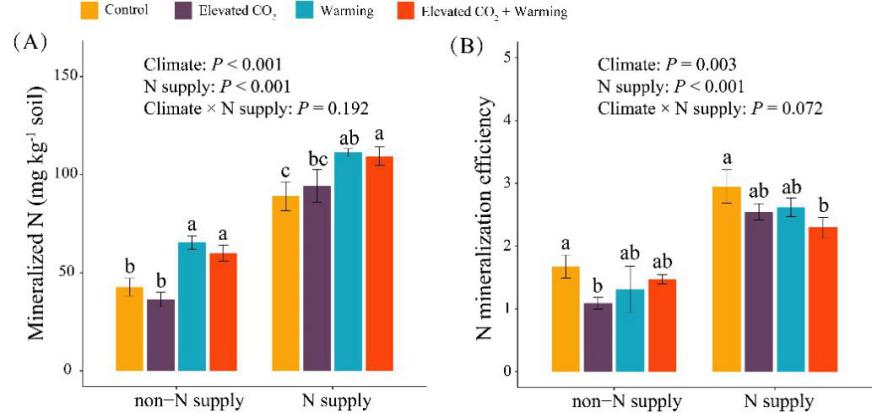 圖4 大氣CO2和溫度升高條件下水稻土壤氮礦化量和氮礦化效率