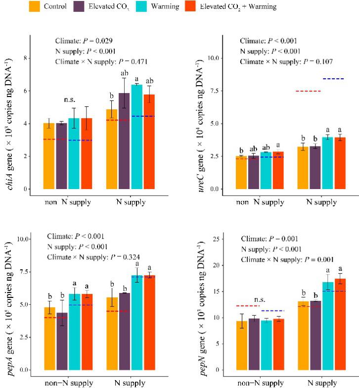 圖5 大氣CO2和溫度升高條件下chiA、ureC、pepA和pepN基因的豐度