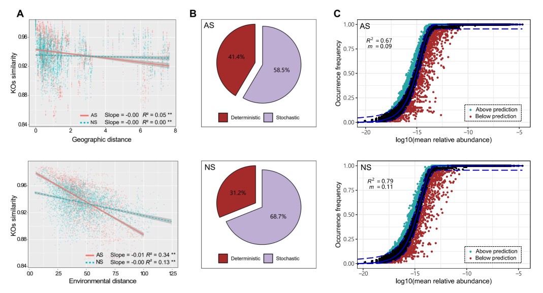 本研究的結(jié)果挑戰(zhàn)了自然生態(tài)系統(tǒng)向農(nóng)業(yè)生態(tài)系統(tǒng)的轉(zhuǎn)變將導(dǎo)致土壤和生物特性的同質(zhì)化同時(shí)降低基因功能多樣性的觀點(diǎn)。農(nóng)田土壤具有高的基因多樣性和功能基因群落異質(zhì)性,是農(nóng)業(yè)土壤隨機(jī)過程減弱和生境同質(zhì)性降低共同作用的結(jié)果。