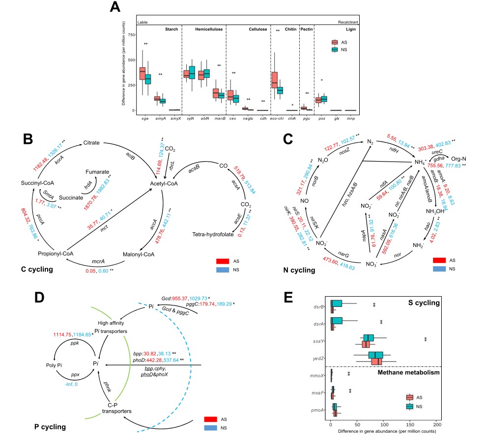圖3. 農(nóng)田土壤和自然土壤介導(dǎo)的碳、氮、硫和磷循環(huán)功能基因分布特征