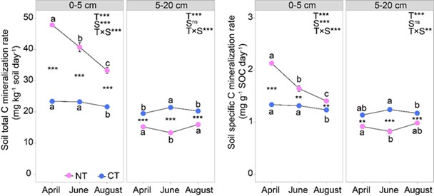 中國科學(xué)院東北地理與農(nóng)業(yè)生態(tài)研究所黑土有機(jī)碳與保護(hù)性耕作學(xué)科組科研人員依托吉林省德惠市始建于2001年的保護(hù)性耕作長期定位實(shí)驗(yàn)開展了相關(guān)研究。意在闡明土壤潛在碳礦化對(duì)長期保護(hù)性耕作的響應(yīng)模式,并探究不同土壤深度下潛在的生物機(jī)制。結(jié)果表明,與常規(guī)耕作相比,秸稈覆蓋還田保護(hù)性耕作顯著提高了表層土壤(0-5 cm)的潛在碳礦化速率,而降低了底土(5-20 cm)的碳礦化速率(圖1)。結(jié)構(gòu)方程模型表明,增加的土壤有機(jī)碳可以直接或通過提高表層土壤生物的生物量來促進(jìn)土壤碳礦化,而在底土中,土壤潛在碳礦化速率的增加主要是通過生物關(guān)聯(lián)的加強(qiáng)來實(shí)現(xiàn)的(圖2和圖3)。這些發(fā)現(xiàn)為土壤生物群落在碳礦化中的作用提供了新的見解,并強(qiáng)調(diào)了不同土壤深度下土壤碳礦化對(duì)耕作方式的響應(yīng)機(jī)制不同。