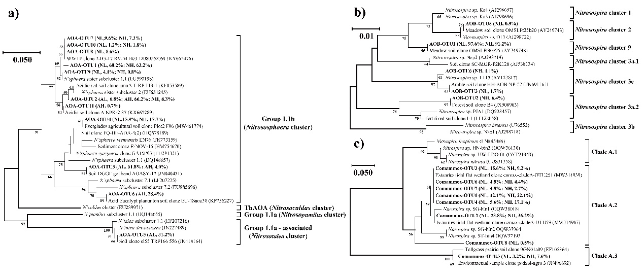 圖2 基于amoA基因13C標記的重層DNA中AOA(a)、AOB(b)和comammox Clade A(c)的氨基酸序列構建的系統發育樹