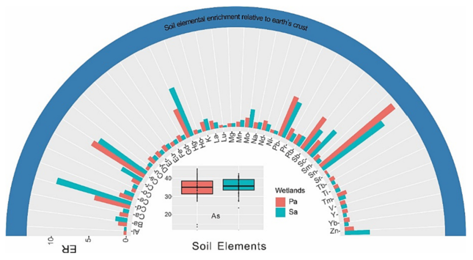 中國科學院東北地理與農業生態研究所濕地生物與環境學科組研究人員通過對全國典型濱海濕地互花米草與蘆葦濕地進行系統調查,對比分析了兩種濕地土壤中45種元素的地球化學集散狀況,并基于相關性系數矩陣構建了量化多元素耦合程度的指標,探討了互花米草入侵對濱海濕地多元素耦合狀態的影響。