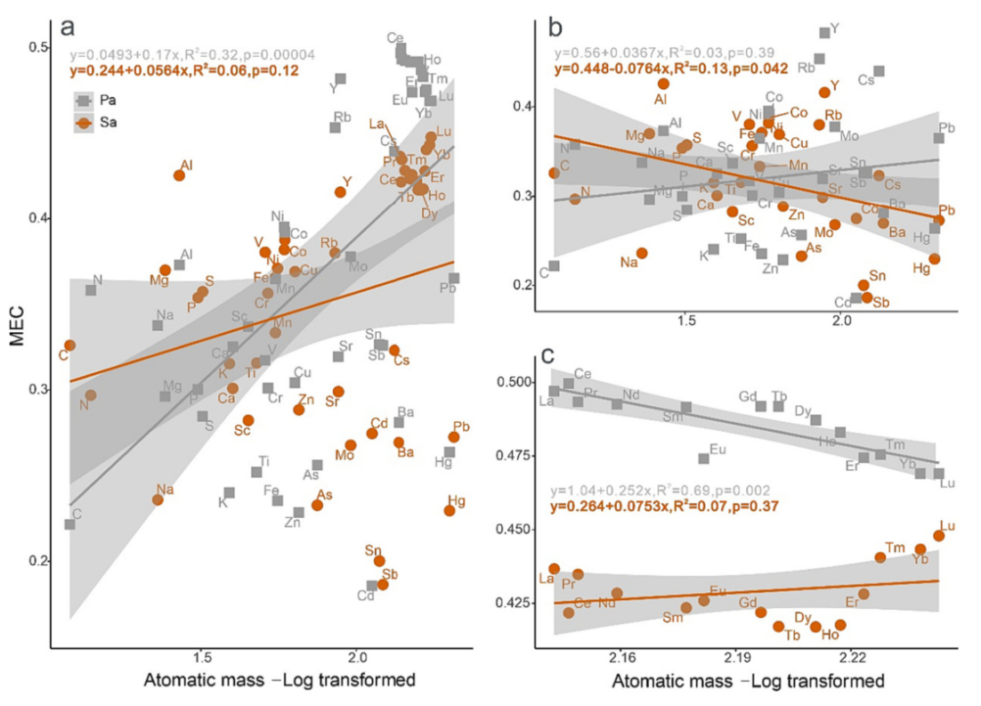 研究結果表明:互花米草入侵不僅重塑了多元素的地球化學集散狀態,而且導致濱海濕地土壤多元素解耦。元素原子量是控制多元素耦合的主要因素,隨著原子量增加,土壤中元素耦合程度增強。原子量與多元素耦合程度在蘆葦濕地中顯著相關,但在互花米草入侵后,這種顯著相關性消失。與較重元素相比,原子量較低元素間的耦合更易受到互花米草入侵的影響,并且耦合程度通常被互花米草入侵所增強?;セ撞菖c蘆葦濕地中稀土元素耦合呈現出截然不同的模式。除了原子量之外,生物過程、海陸作用分別解釋了多元素耦合的17%的10%變異性,生物過程與海陸交互作用共同解釋了13%的多元素耦合變異性。本研究表明,在研究濱?;セ撞萑肭稚鷳B效應時,不僅需要關注其對碳循環過程的影響,也需要考察其導致多元素耦合過程的改變及其可能的多元素生物地球化學過程協同改變。