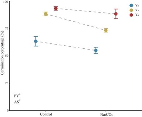 ????研究團隊經過四年的控制實驗,對比分析了種植2-4年(Y2-Y4)的羊草營養繁殖與有性繁殖狀況,并基于不同種植年份羊草植株所產生的種子,進行種子萌發耐堿性評價,探討了羊草種子萌發耐堿性的年際變化。通過對比羊草營養繁殖與有性繁殖的結果發現,營養繁殖使羊草植株密度逐漸升高,密度的變化會導致羊草繁殖策略發生變化;在高密度的情況下,羊草將更多的資源分配到有性繁殖上,以便于種子傳播從而躲避有限的生存空間。同時,隨著種植年份的增加,羊草結實率下降,種子重量顯著增加,結實率與種子重量之間有重要的權衡關系,植物對種子的資源分配體現在種子的數量、大小以及重量上,而不同的資源分配策略是對所處環境的一種適應。Y2植株的結實率較高,每穗實粒數較多,而Y4植株的種子千粒重較高。對于Y4植物產生的較重種子,堿脅迫(25mM Na2CO3)對種子萌發的影響不顯著。該研究表明在有限的空間內,不同種植年份羊草種子產量構成因素存在顯著差異,在連續種植年份產生的種子中,觀察到羊草種子萌發的耐堿性增強,該成果將會為未來羊草人工草地建植及耐鹽堿羊草新品種培育等方面研究提供理論依據。