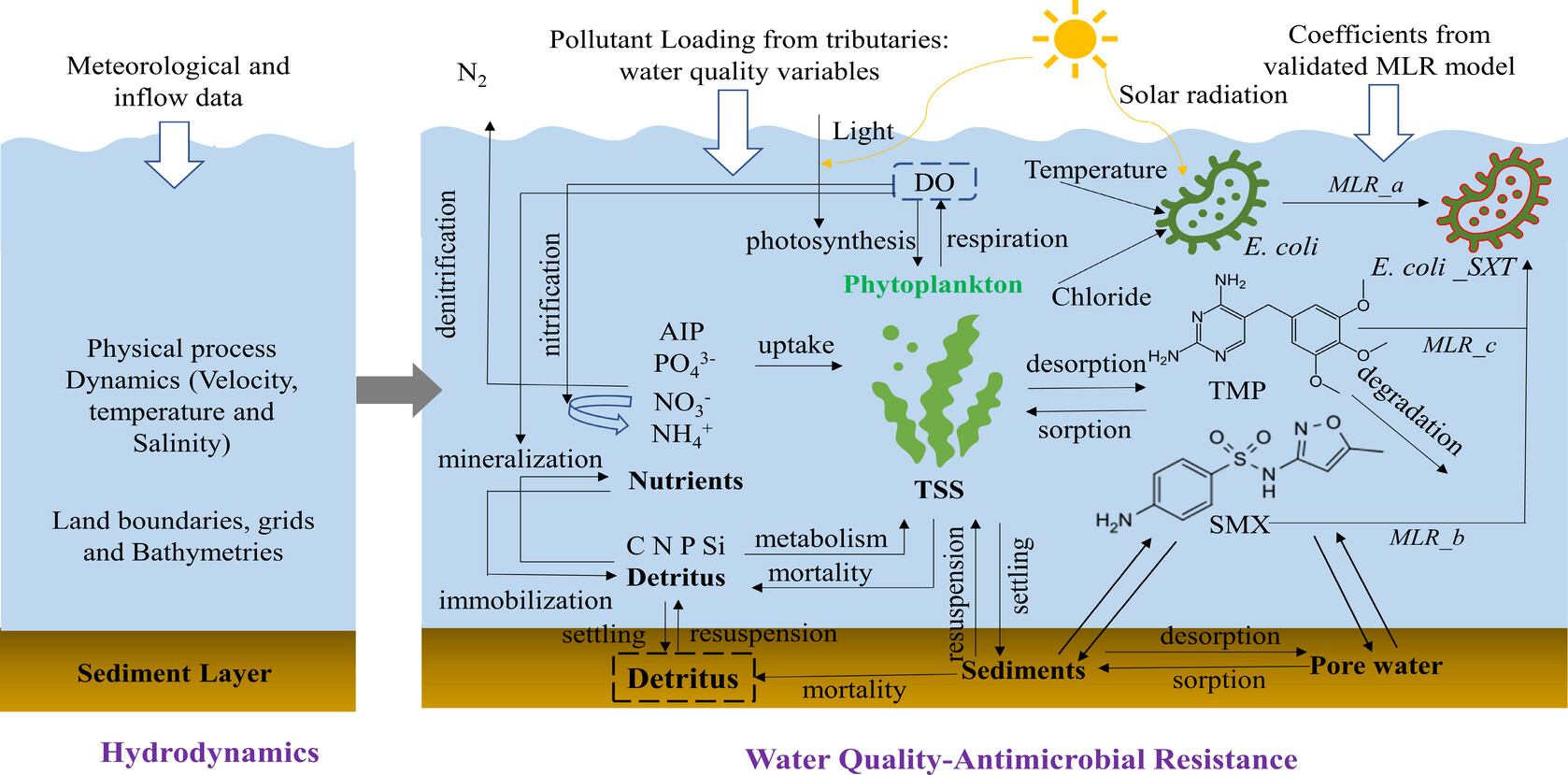 水生環(huán)境中微生物對(duì)抗生素的耐藥性(AMR)日益增加,已被世界衛(wèi)生組織列為人類(lèi)面臨的十大全球公共衛(wèi)生威脅之一。因此,迫切需要建立和量化水生環(huán)境中抗生素和相關(guān)耐藥性風(fēng)險(xiǎn)。中國(guó)科學(xué)院東北地理所張敬杰研究員參與并指導(dǎo)構(gòu)建了綜合建??蚣?,預(yù)測(cè)抗生素、大腸桿菌及其相關(guān)耐藥菌株(ARB)的時(shí)空分布,用于識(shí)別AMR熱點(diǎn),評(píng)估抗生素在水生環(huán)境中的潛在環(huán)境風(fēng)險(xiǎn)。本研究對(duì)兩種具有代表性的抗生素(SMX和TMP)、指示菌(大腸桿菌)及其相關(guān)的ARB(EC_SXT)進(jìn)行了建模。風(fēng)險(xiǎn)評(píng)估表明,預(yù)測(cè)的TMP比SMX具有更高的AMR風(fēng)險(xiǎn),但SMX具有更高的生態(tài)風(fēng)險(xiǎn)。該研究提出了一個(gè)混合建模框架,將統(tǒng)計(jì)模型與水動(dòng)力水質(zhì)模型結(jié)合起來(lái),以整體的方式預(yù)測(cè)AMR,從而促進(jìn)更好的風(fēng)險(xiǎn)管理發(fā)展。