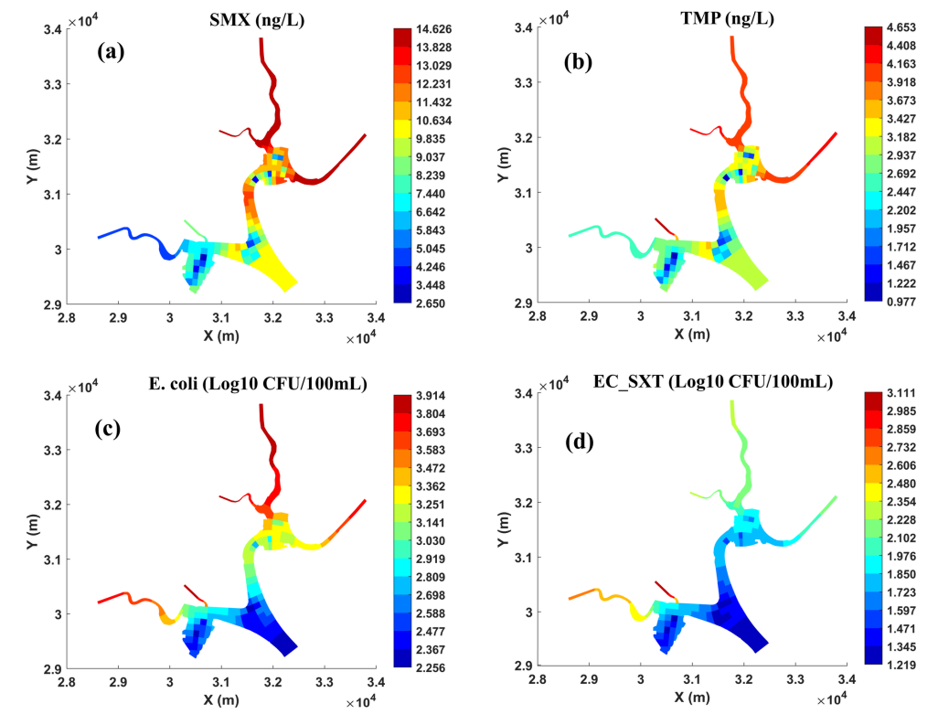 圖4 模擬物質(zhì)的空間分布:(a)SMX;(b)TMP;(c)E.coli;(d)EC_SXT,來(lái)自HWQ-AMR模型