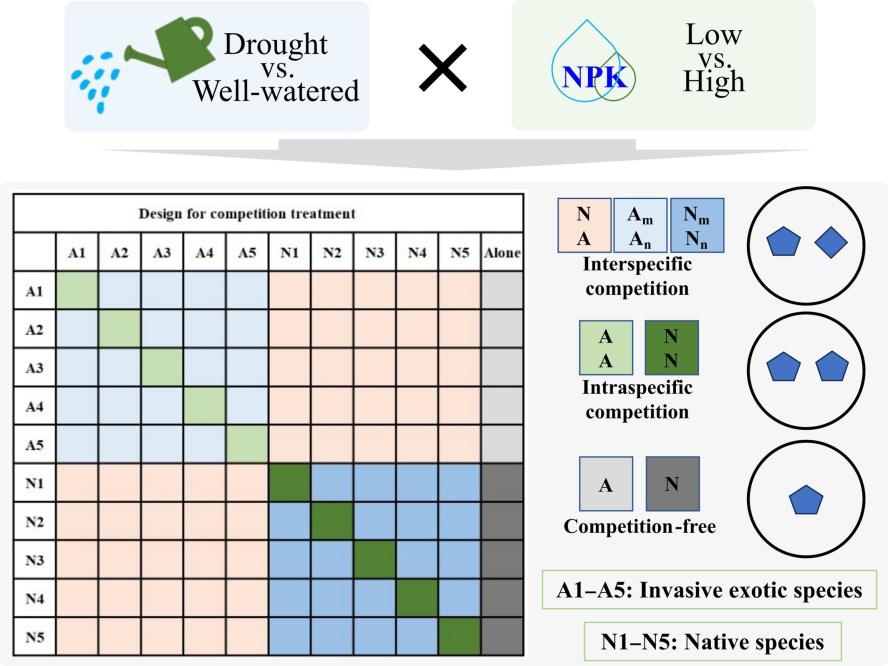 中國科學(xué)院東北地理與農(nóng)業(yè)生態(tài)研究所的生物入侵生態(tài)學(xué)團(tuán)隊(duì)通過溫室盆栽控制實(shí)驗(yàn),探討了多物種之間的相互作用機(jī)制,以解決上述科學(xué)問題(圖1)。實(shí)驗(yàn)選取了5對入侵和本地植物物種作為研究對象,并設(shè)置了三種植物相互作用水平:(1)種內(nèi)競爭,即目標(biāo)植物與同種植物共同生長;(2)種間競爭,即目標(biāo)植物與不同種的本地或入侵植物共同生長;(3)無競爭,即目標(biāo)種單獨(dú)種植。這些植物間相互作用處理進(jìn)一步與兩種土壤水分水平(干旱與充足水分)及兩種土壤養(yǎng)分水平(低養(yǎng)分與高養(yǎng)分)進(jìn)行了全因子交互設(shè)置。