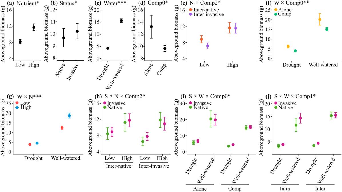 結(jié)果顯示,低養(yǎng)分條件下,與目標(biāo)本地植物相比,目標(biāo)入侵植物與其他入侵植物共同生長時(shí)獲得更大的地上生物量,而高養(yǎng)分條件下,目標(biāo)入侵植物與其他入侵植物共同生長時(shí)表現(xiàn)較差(圖2h)。此外,低養(yǎng)分環(huán)境中,無論目標(biāo)植物是否為入侵物種,本地競爭者促進(jìn)目標(biāo)植物的地上生物量(圖2e)。種間競爭中,干旱對本地目標(biāo)植物生長的負(fù)面影響更顯著;而無論競爭類型如何,目標(biāo)入侵植物與目標(biāo)本地植物受干旱脅迫影響相似(圖2j)。