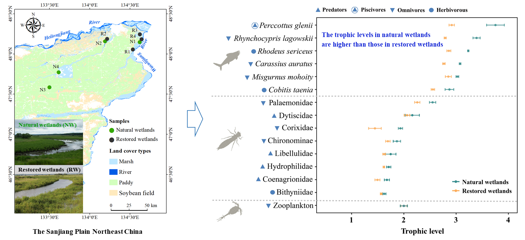 濕地作為地球上山水林田湖草生命共同體的重要組成,具有不可替代的生態(tài)功能。受氣候變化和人類活動的疊加影響,全球濕地退化嚴(yán)重,引發(fā)了一系列的生態(tài)環(huán)境問題。濕地生態(tài)恢復(fù)受到國內(nèi)外高度關(guān)注,廣泛實施了較大規(guī)模的濕地恢復(fù)工程。2002年以來,中國黑龍江三江平原開展了一系列淡水沼澤濕地恢復(fù)示范性工作,但缺乏針對濕地生境功能恢復(fù)成效的評估研究。為此,中國科學(xué)院東北地理所科研人員以黑龍江省三江平原沼澤濕地為研究對象,應(yīng)用水生無脊椎動物作為關(guān)鍵指示生物類群,通過大量野外調(diào)查和定位研究,采用功能性狀與穩(wěn)定同位素表征方法,開展了濕地恢復(fù)成效評估研究。