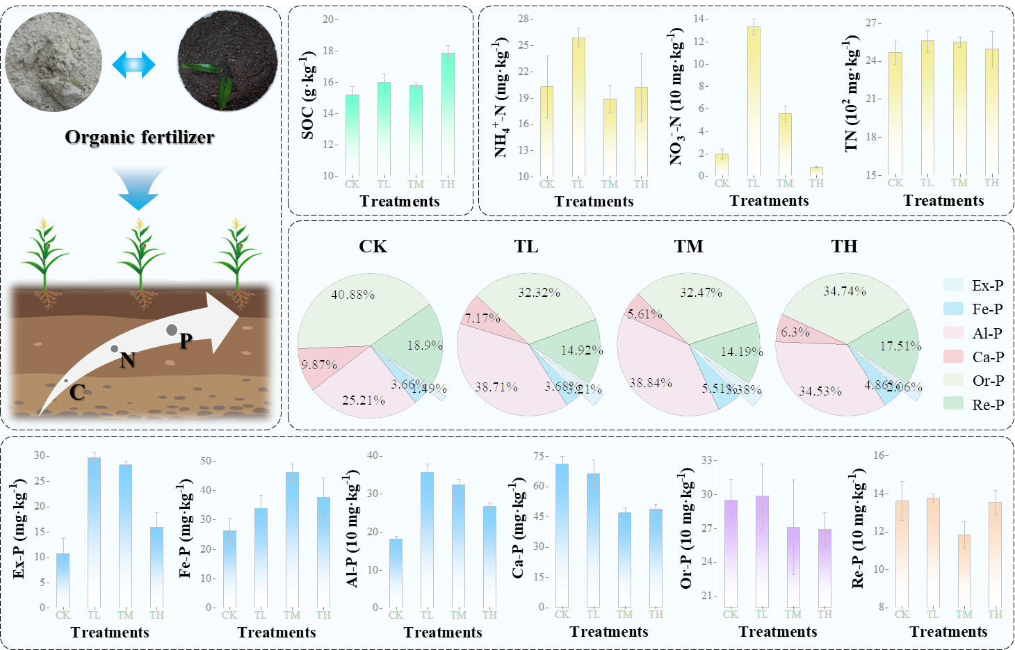 聚焦黑土有機培肥耕地質(zhì)量保育與面源污染防控關(guān)鍵科學問題,東北地理所水環(huán)境污染與防治團隊依托吉林省杏木國家水土保持科技示范園,基于10年有機-無機肥混施非控制野外試驗研究(混施質(zhì)量比:0%、30%、60%和100%),探明了化肥減量配施有機肥土壤中碳、氮、磷的積累效應,以及地表徑流中氮、磷的輸出特征與污染負荷。結(jié)果表明,化肥減量配施有機肥提高了土壤微團聚體的黏連效應及其對土壤有機質(zhì)的物理保護作用。同時,化肥減量配施有機肥提高了土壤微生物的豐度和功能酶的活性,促進了礦物結(jié)合態(tài)氮、磷的溶解,以及有機態(tài)氮、磷的礦化。基于黑土培肥地力與污染防控相協(xié)同的目標,化肥減量30%配施有機肥是適于東北黑土區(qū)的最佳有機-無機肥配施比例。與對照組(有機肥配施比0%)相比較,該處理組土壤有機碳(SOC)、氨氮(NH4+-N)、硝氮(NO3--N)和速效磷(AP)的含量分別提高了18%、30%、570%和163%,地表徑流中總磷(TP)濃度降低了55%。但是,化肥減量配施有機肥在一定程度上提高了地表徑流中總氮(TN)的濃度,特別是化肥減量60%條件下,需重點關(guān)注氮素隨地表徑流流失的風險。