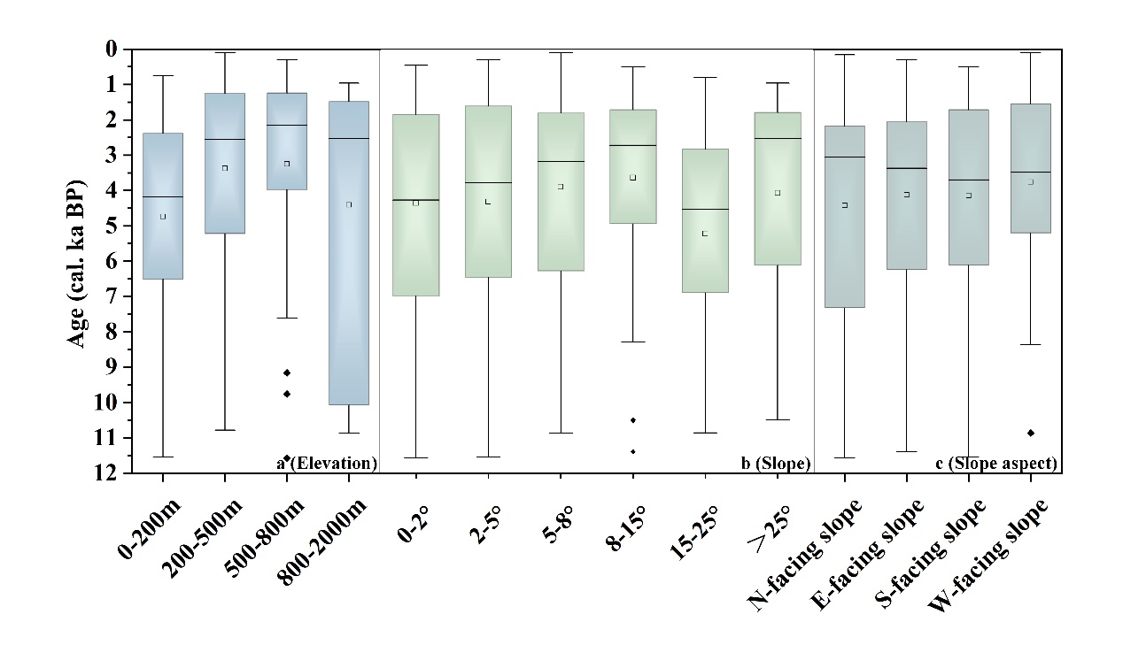 圖1?全新世東北地區(qū)泥炭沼澤在不同海拔、坡度和坡向地形下形成時(shí)間