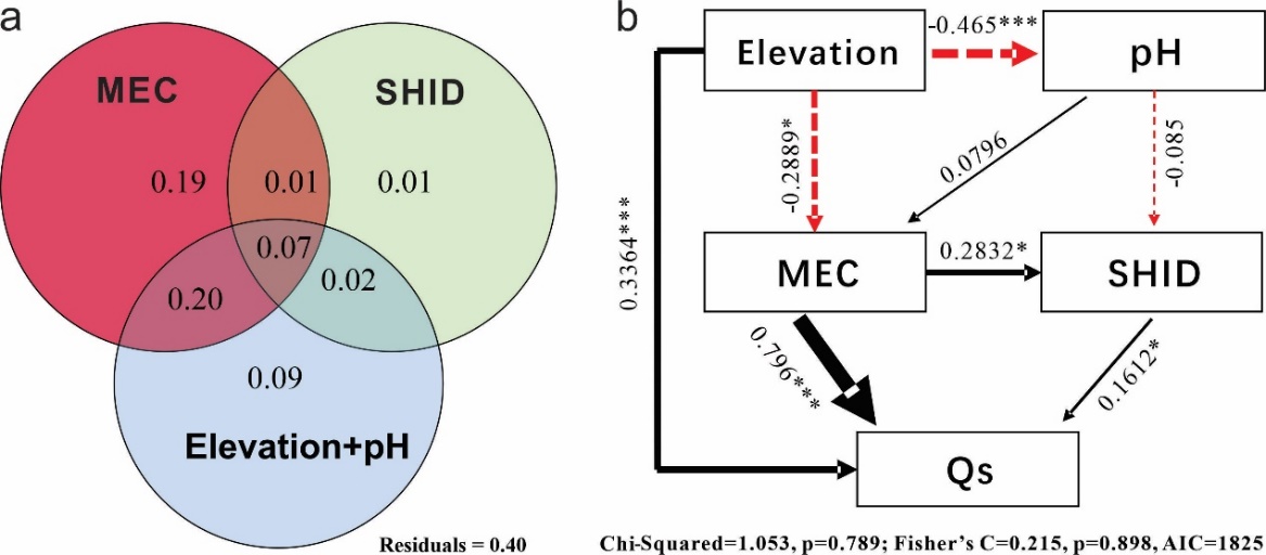 VPA分析證實MEC對Qs的影響最大,MEC可單獨解釋Qs變化的19%, MEC與環(huán)境因素(海拔和pH)結合可以共同解釋20%的Qs變異性(圖3a)。環(huán)境因素或SHID單獨對Qs變異的解釋能力相對較低,分別為9%和1%,而MEC、SHID和環(huán)境因素聯(lián)合可解釋60%的Qs變異性。SEM模型顯示海拔、MEC和SHID均對Qs具有正效應,其大小順序為MEC>海拔>SHID(圖3b)。