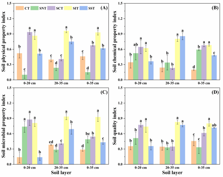 圖1. 秸稈還田對土壤質(zhì)量、土壤物理、化學和微生物性質(zhì)指數(shù)的影響。CT,常規(guī)耕作;SNT,免耕與秸稈還田相結合;SCT,常規(guī)耕作與秸稈還田相結合;SIT,深翻與秸稈還田相結合;SST,秸稈填埋還田。