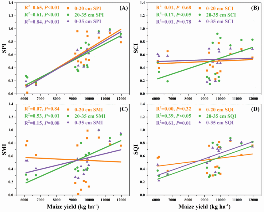 圖2. 玉米產(chǎn)量與土壤性質(zhì)指標的相關性擬合。SQI,土壤質(zhì)量指數(shù);SPI,土壤物理性質(zhì)指數(shù);SCI,土壤化學性質(zhì)指數(shù);SMI,土壤微生物特性指數(shù)。
