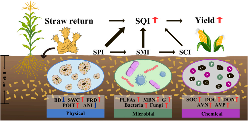 東北地理所黑土保護與利用學科組研究人員依托位于黑土區(qū)的秸稈還田長期定位試驗,探究了秸稈還田深度對土壤質(zhì)量和玉米產(chǎn)量的影響,通過分析土壤物理性質(zhì)指數(shù)(SPI)、化學性質(zhì)指數(shù)(SCI)和微生物性質(zhì)指數(shù)(SMI)與土壤質(zhì)量指數(shù)(SQI)和作物產(chǎn)量的關系,解析了適宜的秸稈還田方式在改善土壤質(zhì)量、提升玉米產(chǎn)量方面的驅(qū)動機制,研究結果對提高土壤質(zhì)量和制定可持續(xù)農(nóng)業(yè)發(fā)展策略具有重要指導意義。