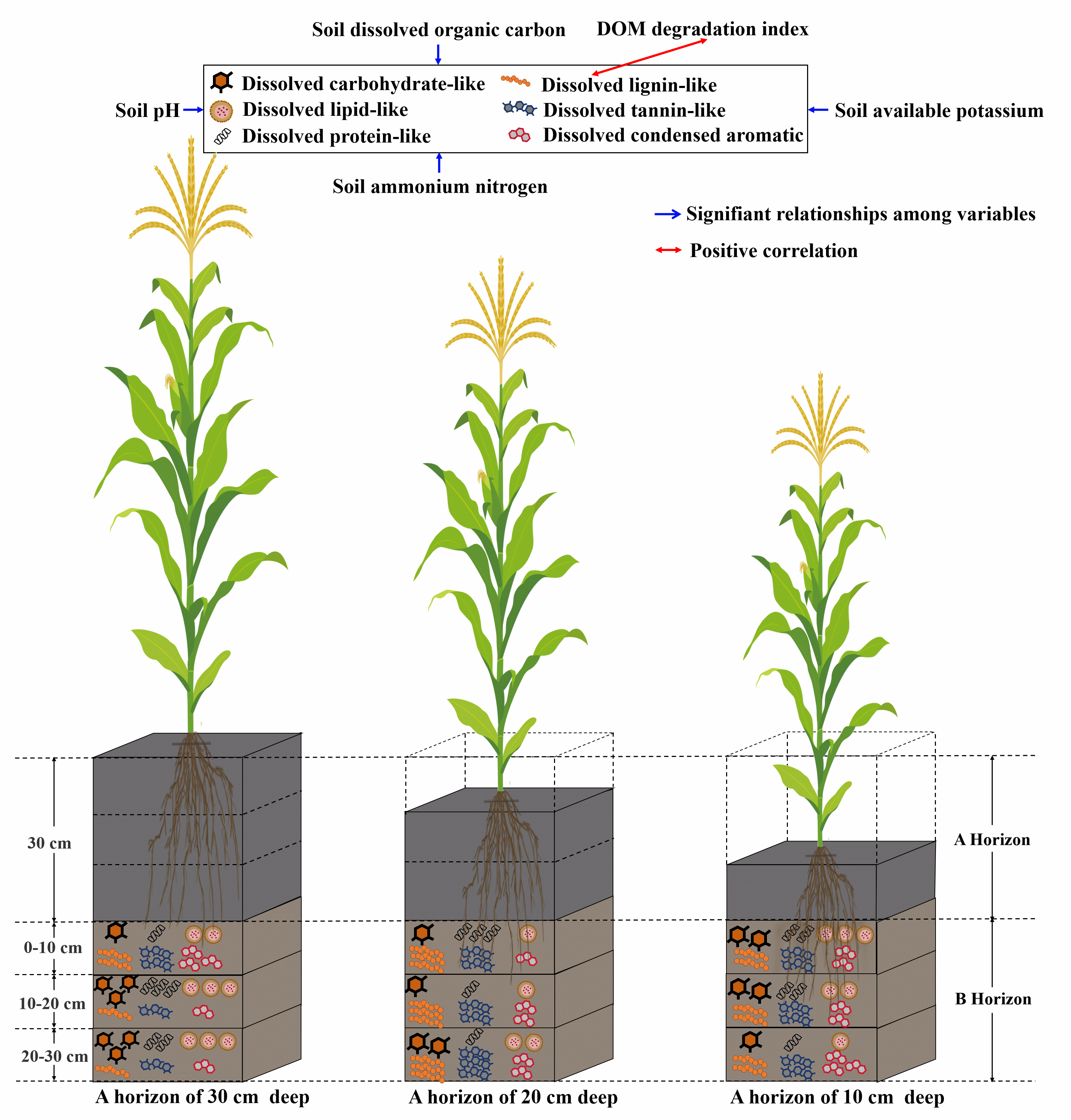 土壤溶解性有機(jī)質(zhì)(DOM)化學(xué)多樣性是指土壤中DOM分子的化學(xué)組成和性質(zhì)的多樣性。土壤侵蝕導(dǎo)致的亞耕層(B層)暴露會顯著影響土壤的含水量、pH值和養(yǎng)分有效性等,進(jìn)而對DOM的動態(tài)變化產(chǎn)生影響。了解侵蝕土壤中影響DOM化學(xué)多樣性的具體因素,對于預(yù)測在這些變化條件下DOM和土壤有機(jī)質(zhì)(SOM)的反應(yīng)性和動態(tài)至關(guān)重要。因此,明晰不同侵蝕程度下0-10、10-20和20-30 cmB層中的DOM化學(xué)多樣性的變化情況及其DOM的降解程度,探究影響B(tài)層DOM化學(xué)多樣性變化的關(guān)鍵因素,將有助于加深對土壤中DOM分子持久性和多樣性的認(rèn)識,從而促進(jìn)對侵蝕土壤中碳循環(huán)的預(yù)測。