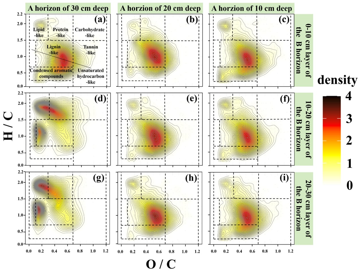圖1基于van Krevelen圖的DOM組分的化學(xué)式核密度圖。顏色越深表示分子密度越高。