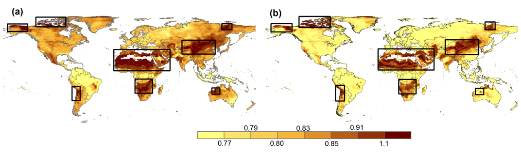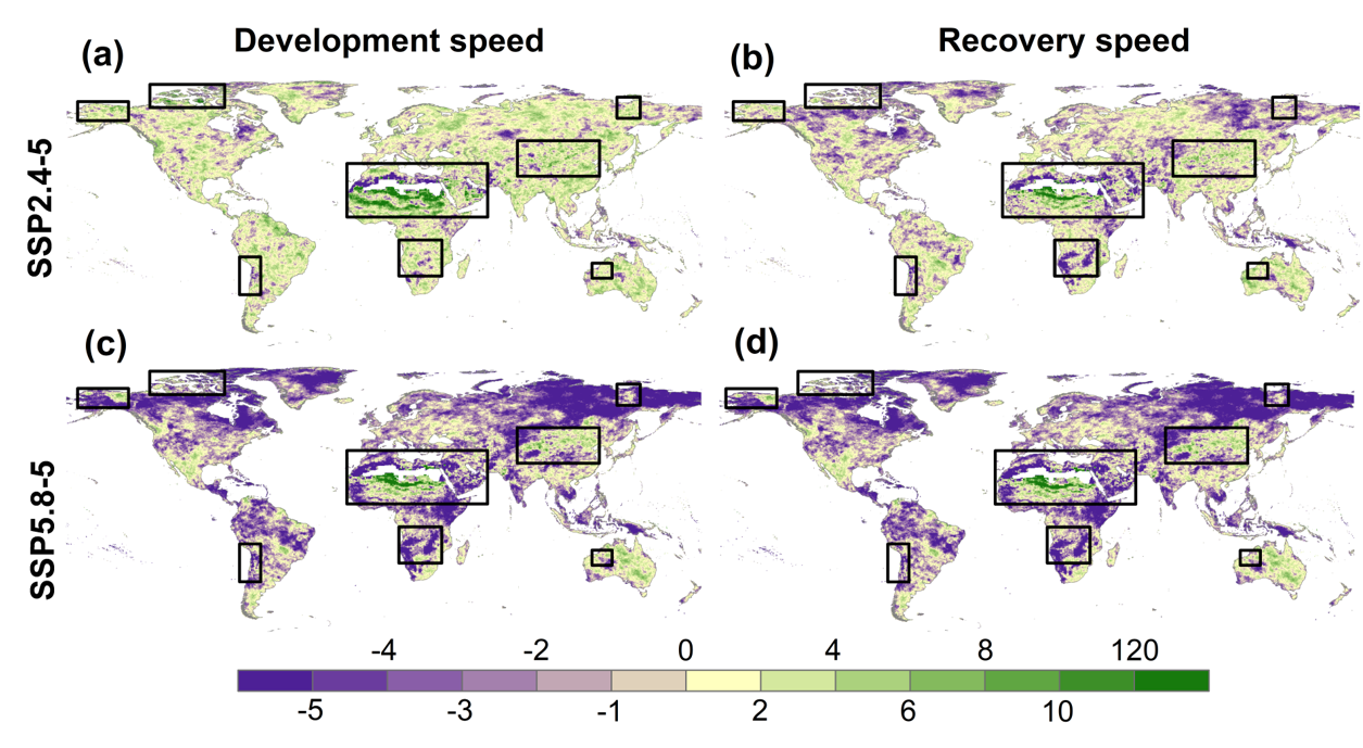 圖2. 1950-2014年全球的干旱瞬時發(fā)展速度(a)和瞬時恢復速度(b)的空間分布。黑框表示全球八個干旱發(fā)展和恢復速度較快的熱點區(qū)域。