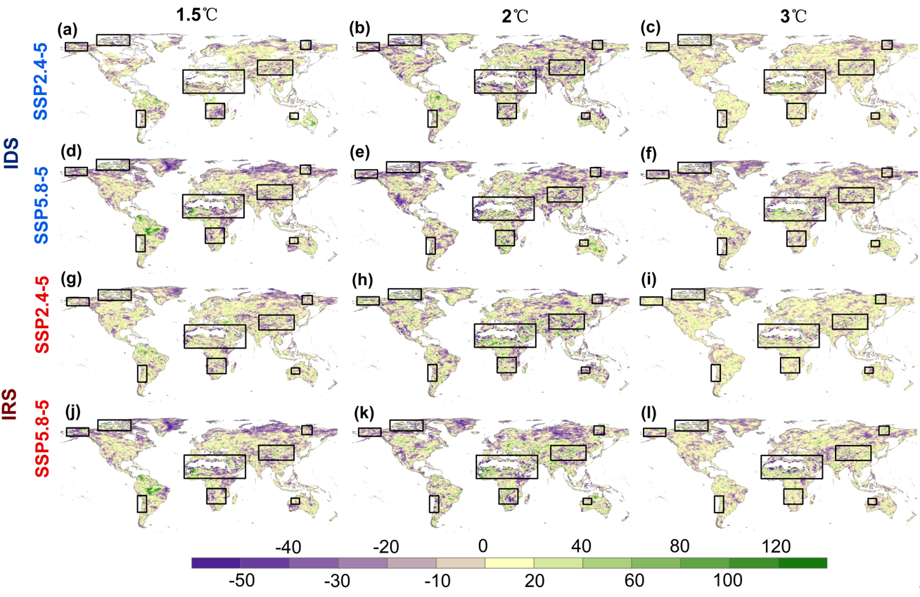 圖4. 與歷史多模型均值相比,SSP245和SSP585情景下不同升溫水平(1.5℃、2℃和3℃)下干旱瞬時發(fā)展速度(IDS)和瞬時恢復速度(IRS)的相對變化(%)。