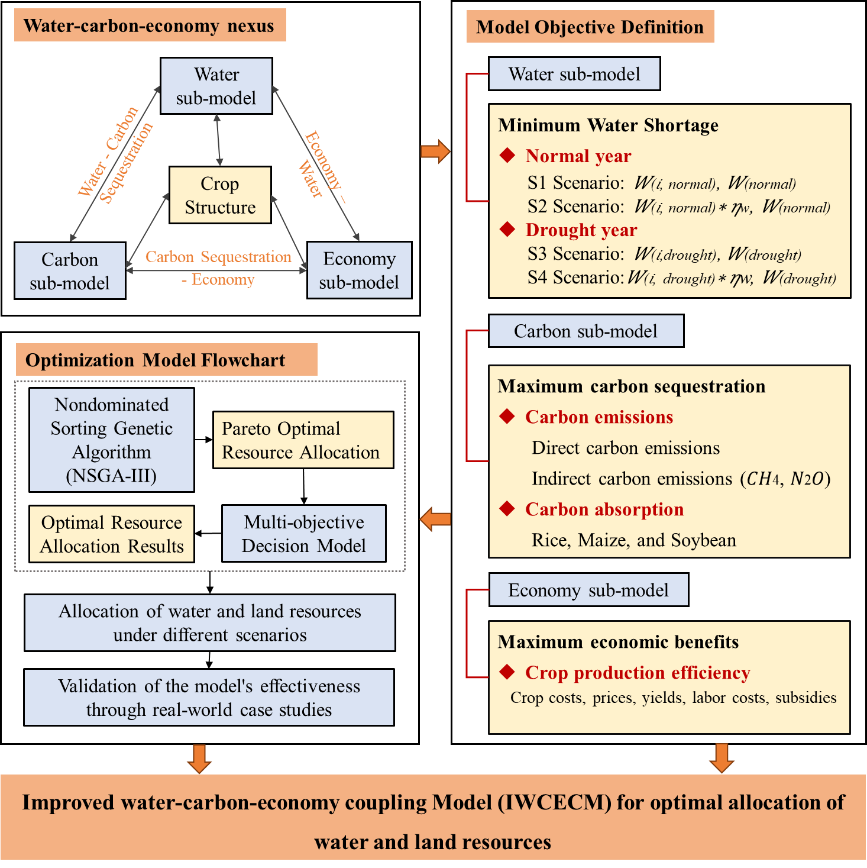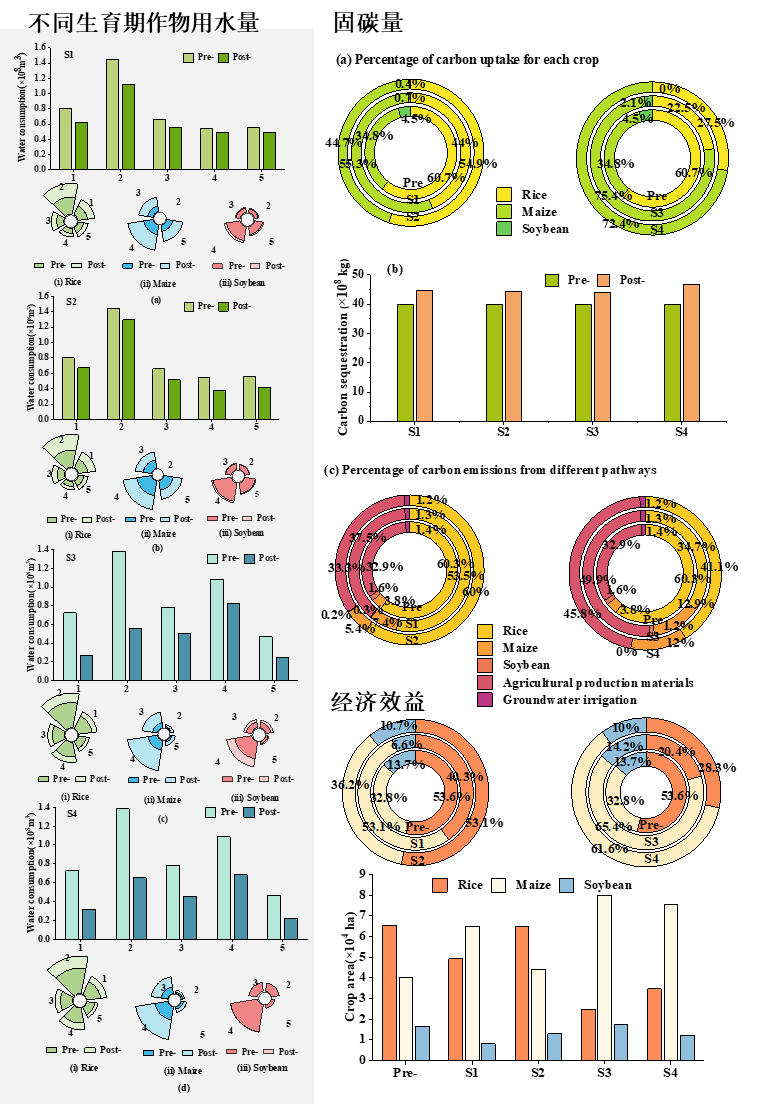 本研究突破了以往水資源分配中對(duì)作物需水過(guò)程過(guò)度概化的問(wèn)題,并對(duì)我們之前研發(fā)的WCECM模型進(jìn)行了改進(jìn)。研究從作物灌溉用水、種植結(jié)構(gòu)、固碳量、經(jīng)濟(jì)效益和產(chǎn)量等多個(gè)角度進(jìn)行了深入分析。基于作物需水過(guò)程,提出了不同水文情景下的作物種植結(jié)構(gòu)和水資源優(yōu)化配置方案。通過(guò) NSGA-III 算法選擇最優(yōu)解,并提出有針對(duì)性的優(yōu)化策略。最后將改進(jìn)的水-碳-經(jīng)濟(jì)耦合模型(IWCECM)在中國(guó)具有代表性的農(nóng)業(yè)主產(chǎn)區(qū)——三江平原友誼農(nóng)場(chǎng)進(jìn)行應(yīng)用和驗(yàn)證。結(jié)果表明,改進(jìn)后的模型不僅能夠根據(jù)不同情景精確調(diào)整作物種植結(jié)構(gòu),管理每種作物在不同生長(zhǎng)階段的灌溉用水需求,還能提高固碳量、經(jīng)濟(jì)收入和糧食產(chǎn)量。具體而言,優(yōu)化后,平水年常規(guī)灌溉模式 (S1) 和節(jié)水灌溉模式 (S2)以及干旱年份的常規(guī)灌溉模式 (S3) 和節(jié)水灌溉模式 (S4)下的種植面積比例分別為4:5:1、5:4:1、2:7:1和3:6:1。與優(yōu)化前相比,四種方案的總固碳量分別增加了4.95×108 kg、4.56×108 kg、4.04×108 kg和6.84×108 kg,糧食總產(chǎn)量分別增加了1.72×108 kg、1.43×108 kg、0.69×108 kg和1.45×108 kg。除枯水年外,其他方案下的經(jīng)濟(jì)效益與優(yōu)化前無(wú)明顯差異。在平水年,作物在生長(zhǎng)初期的總用水量最高;在枯水年,作物在生長(zhǎng)中期的總用水量最高。該結(jié)果不僅對(duì)解決當(dāng)前農(nóng)業(yè)水資源和土地資源的相關(guān)挑戰(zhàn)具有現(xiàn)實(shí)意義,也為未來(lái)農(nóng)業(yè)的可持續(xù)發(fā)展提供了參考和建議。