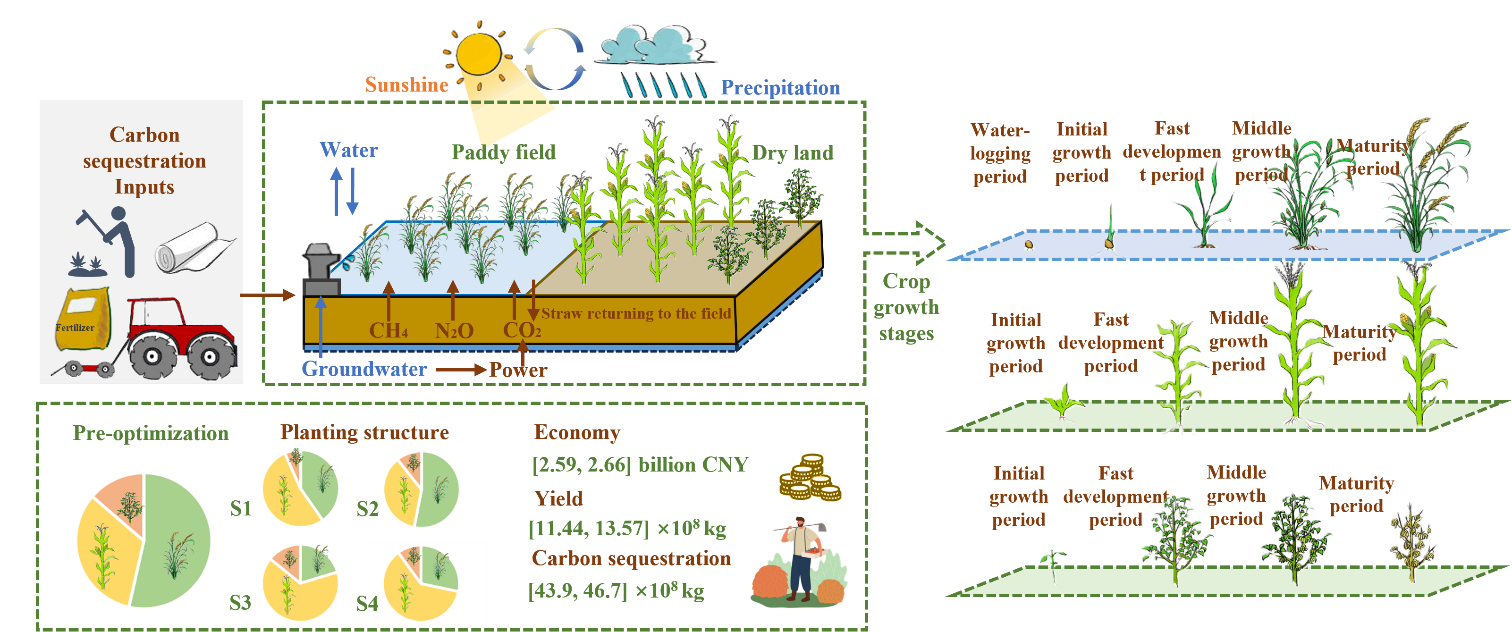 農(nóng)業(yè)灌溉占用全球取用水總量的70%以上。在國(guó)家“四水四定”的戰(zhàn)略背景下,解決水土資源時(shí)空不匹配的問(wèn)題對(duì)保障我國(guó)糧食安全至關(guān)重要。水土資源之間聯(lián)系錯(cuò)綜復(fù)雜,任何一種資源的短缺都會(huì)限制另一種資源的利用,從而降低水土資源的綜合利用效率。在開展農(nóng)業(yè)水土資源優(yōu)化配置研究時(shí),如何協(xié)調(diào)二者之間關(guān)系是亟需解決的關(guān)鍵科學(xué)問(wèn)題。然而,由于極端氣候頻率不斷增加和下墊面條件復(fù)雜性加劇,水資源年際間和年內(nèi)變異系數(shù)顯著增強(qiáng),充分滿足農(nóng)作物生長(zhǎng)過(guò)程的水資源可持續(xù)供給面臨著巨大的挑戰(zhàn)。特別是在干旱時(shí)期,降水量的減少使得可供作物生長(zhǎng)的有效降水量大幅下降,從而加劇了農(nóng)業(yè)生產(chǎn)用水的壓力。同時(shí),農(nóng)業(yè)生產(chǎn)過(guò)程中過(guò)量施用化肥、農(nóng)藥和農(nóng)業(yè)機(jī)械會(huì)導(dǎo)致大量碳排放,對(duì)生態(tài)系統(tǒng)的穩(wěn)定構(gòu)成威脅。因此,從水-碳-糧食耦合視角開展基于作物需水過(guò)程的農(nóng)業(yè)水土資源優(yōu)化配置研究對(duì)保障我國(guó)糧食安全具有重要意義。