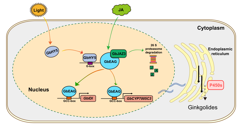 圖5. JA和光信號通過GbEAG和GbHY5協同調控銀杏內酯的生物合成