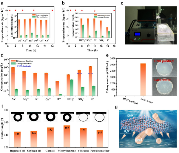 在實(shí)際應(yīng)用中,DNH對(duì)重金屬污染的工業(yè)廢水(圖2a)、蘇打鹽堿水(圖2b)都表現(xiàn)出極好的處理效果。采用中國(guó)北方近海海水進(jìn)行了戶外太陽(yáng)能淡化實(shí)驗(yàn),結(jié)果顯示,水體中Na+、Mg2+、K+、Ca2+、B3+、HCO3?、SO42?和Cl?的含量在處理后分別為 0.025、0.014、0.023、0.037、0.001、6.995、0.079和0.157 mg/L,對(duì)應(yīng)的去除率分別為99.999%、99.999%、99.994%、99.990%、99.957%、95.062%、99.996% 和99.999%(圖2d)。凈化水中各種離子的濃度遠(yuǎn)低于中國(guó)和WHO規(guī)定的飲用水標(biāo)準(zhǔn)限值。此外,DNH具有良好的除菌效果(圖2e),以及水下超疏油性,其對(duì)菜籽油、大豆油、玉米油和三種油性溶劑的接觸角均超過(guò)145°(圖2f),實(shí)現(xiàn)了優(yōu)異的防污能力,體現(xiàn)了其廣泛的應(yīng)用潛力。