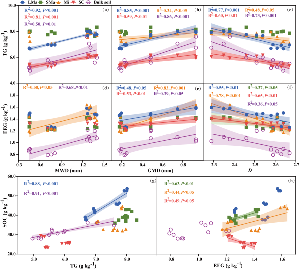 東北地理所黑土保護與利用學(xué)科組研究人員以1985年在東北黑土區(qū)建立的四種不同土地利用類型(裸地、農(nóng)田、草地和林地)為研究對象,利用團聚體分級的方法探討了不同團聚體粒徑中SOC、全氮(TN)以及GRSP(總球囊霉素TG和易提取球囊霉素EEG)的含量變化。研究結(jié)果表明,草地和林地生態(tài)系統(tǒng)的大團聚體比例、SOC、TN和GRSP含量均顯著高于農(nóng)田和裸地。TG在原土和大團聚體中的含量與土壤有機碳呈顯著正相關(guān),而EEG在較小團聚體粒徑中發(fā)揮了更重要的作用。球囊霉素組分在不同團聚體尺寸中對土壤有機碳積累的差異性影響,突顯了SOC動態(tài)的復(fù)雜性以及考慮團聚體尺度過程的重要性。此外,我們觀察到GRSP組分與土壤團聚體穩(wěn)定性之間存在顯著正相關(guān)關(guān)系。這些發(fā)現(xiàn)強調(diào)了GRSP作為一種持久性結(jié)合劑的關(guān)鍵作用,它積極參與土壤團聚體的形成和穩(wěn)定,從而間接增強了土壤有機碳的保護和持久性。總體而言,本研究揭示了土地利用方式、土壤團聚體、GRSP和SOC之間的復(fù)雜關(guān)系。研究結(jié)果強調(diào)了保護和恢復(fù)自然植被覆蓋(如草地和林地)對于促進土壤有機碳固存和緩解氣候變化的關(guān)鍵重要性。