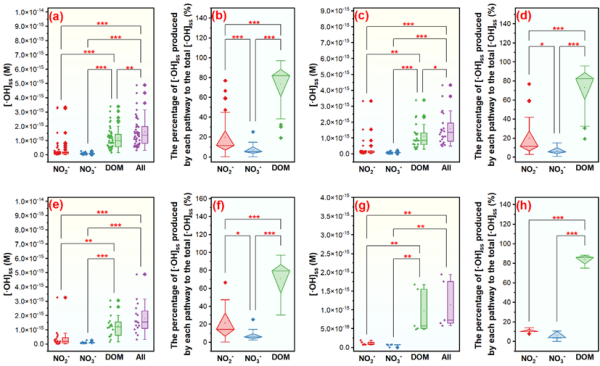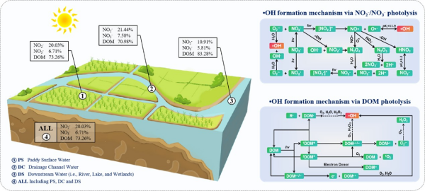 研究發(fā)現(xiàn),RIs的生成與水體中常規(guī)理化指標(biāo)之間存在復(fù)雜的相互作用關(guān)系(圖1)。單線態(tài)氧(1O2)的生成對(duì)pH較為敏感,三重激發(fā)態(tài)DOM(3DOM*)主要受鹽分調(diào)節(jié),而羥基自由基(?OH)受NO2-、NO3-和DOM的影響更大;水體中的磷對(duì)RIs呈現(xiàn)出雙重調(diào)節(jié)作用:一方面RIs穩(wěn)態(tài)濃度隨著TP濃度升高而增加;另一方面,過量的磷則會(huì)通過競(jìng)爭性抑制作用降低RIs的量子產(chǎn)率。?OH作為自然界中最普遍存在且氧化能力最強(qiáng)的活性氧物種,其生成過程與1O2和3DOM*相比更為復(fù)雜。因此,本研究進(jìn)一步探究了?OH的主要生成過程與潛在機(jī)制。結(jié)果表明,NO2-、NO3-和DOM的光化學(xué)反應(yīng)對(duì)?OH生成的貢獻(xiàn)率分別為19.50%、6.93%和73.57%,證實(shí)DOM光解是鹽堿化農(nóng)業(yè)水體中?OH的主要生成途徑(圖2)。光譜學(xué)特征分析表明,在鹽堿化農(nóng)業(yè)水體中,相較于DOM濃度,其平均分子量對(duì)RIs生成的影響更大。整體而言,鹽堿化地區(qū)農(nóng)業(yè)水體從源頭經(jīng)由溝渠流入下游河湖水體的過程中,DOM光解始終是?OH的主要生成途徑,且在下游水體中占比最高(83.28%);NO2-和NO3-光解的貢獻(xiàn)相對(duì)較小,且在下游水體中兩者對(duì)?OH生成的貢獻(xiàn)占比均降低。