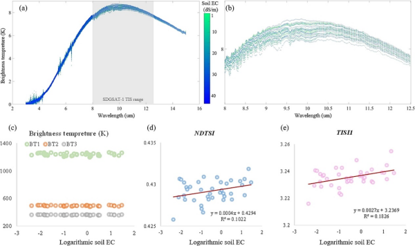 圖1. 熱紅外波段對不同鹽度水平土壤樣本(n =39)的光譜響應(yīng)敏感性:(a) 3-15μm范圍內(nèi)土壤樣本的地面測量亮度溫度;(b) 8-12.5μm范圍內(nèi)(SDGSAT-1 TIS的光譜覆蓋范圍)土壤樣本的地面測量亮度溫度;(c) 衛(wèi)星等效亮度溫度與土壤導(dǎo)電率(LnEC)之間的關(guān)系;(d)NDTIS與土壤導(dǎo)電率(LnEC)之間的關(guān)系;(e)TISI1與土壤導(dǎo)電率(LnEC)之間的關(guān)系