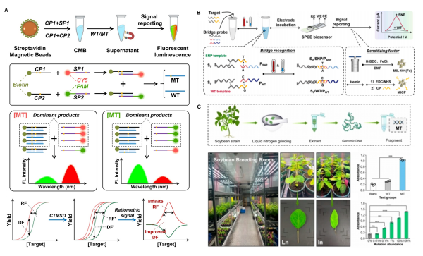 圖1. (A)比率信號擴增輸出窗口、(B)橋聯(lián)探針識別SNP以及(C)大豆基因組提取與檢測示意圖