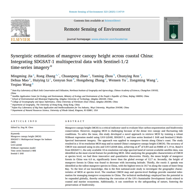 該研究發(fā)表在國際頂級期刊《Remote Sensing of Environment》,中國科學(xué)院東北地理與農(nóng)業(yè)生態(tài)研究所為第一完成單位,賈明明副研究員為第一作者,張蓉特別研究助理為通訊作者。研究獲國家重點研發(fā)計劃青年科學(xué)家項目(2023YFF1305600)、國家自然科學(xué)基金(42076161,42101392)及可持續(xù)發(fā)展大數(shù)據(jù)國際研究中心開放研究計劃項目(CBAS2022ORP06)支持。