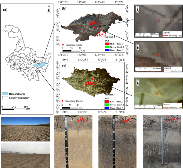 圖1 研究區(qū)及采樣點(diǎn)分布圖。圖(a)為研究區(qū)位置,圖(b)和(c)為曙光農(nóng)場(chǎng)和852農(nóng)場(chǎng)采樣點(diǎn)